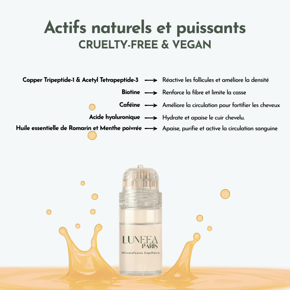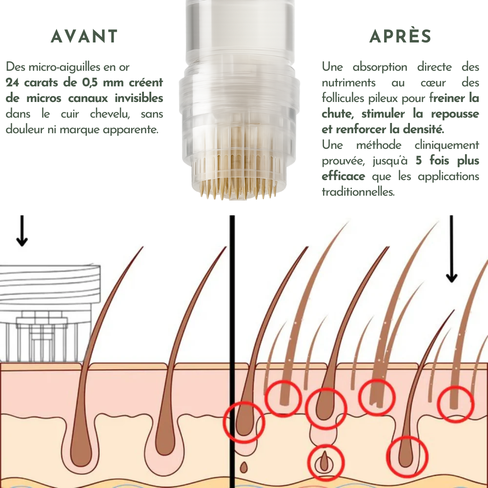 Le dispositif utilise de fines micro-aiguilles de 0,5 mm qui créent de micro-canaux dans le cuir chevelu. Cela permet au sérum riche en Copper Tripeptide-1, caféine, biotine et autres actifs de pénétrer profondément, stimulant les follicules et favorisant la repousse.