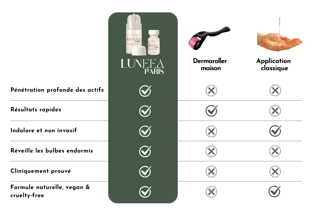 Grâce à des micro-aiguilles précises, les actifs pénètrent directement au niveau des follicules. Résultat : une absorption maximale, une repousse stimulée et des cheveux plus forts dès la racine.