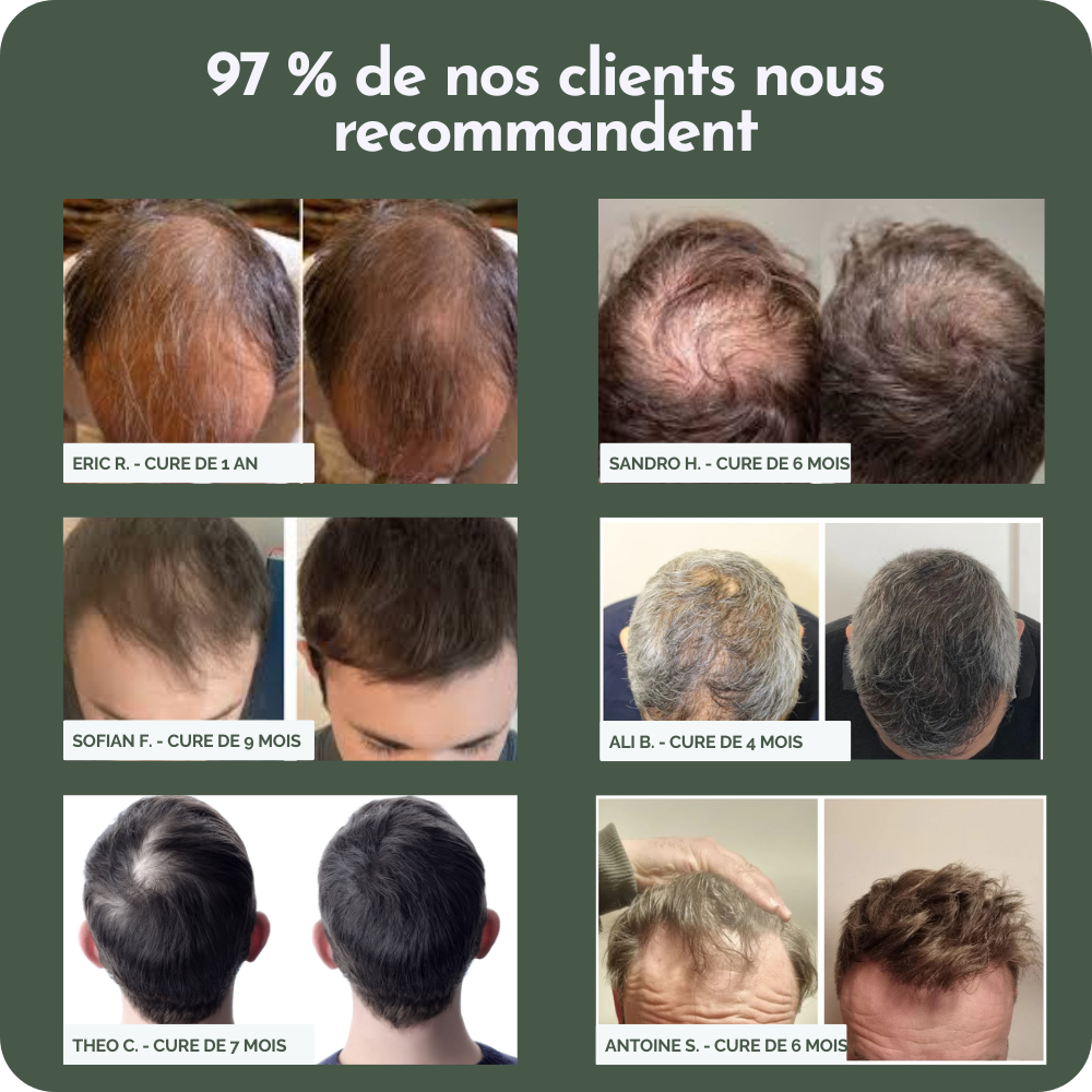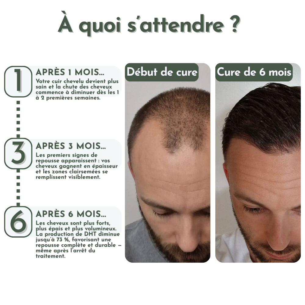 La plupart des utilisateurs constatent une amélioration de la densité et de la force des cheveux en 4 à 6 semaines avec une utilisation régulière.